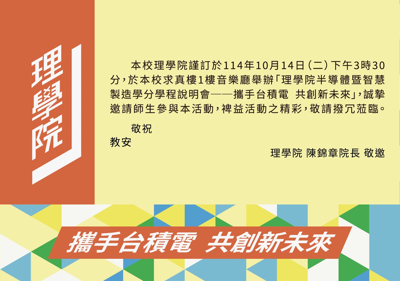 本校理學院於114年10月14日下午3時30分辦理「半導體暨智慧製造增能學分學程說明會」,敬邀本校師生與會