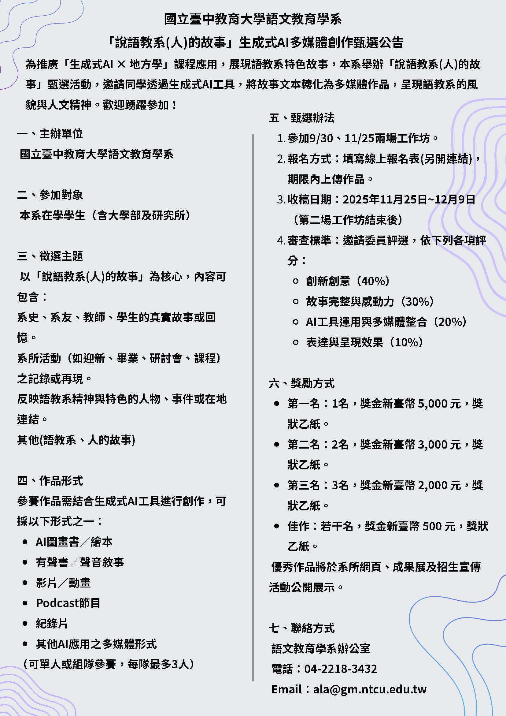On the afternoon of September 30th, the Department of Language and Literacy Education at Taichung University of Education invited Chang Chia-Tse, the owner of Mei Fa Dang Loo Shang Stuido and lecturer at the Asia University, to hold an academic lecture titled "Telling the Story of the Language and Literacy Education Department (and People) - AI Workshop." The workshop allowed students to unleash their creativity, learning how to create comics, storybooks, and podcasts with AI. Students were encouraged to use their own experiences and emotions, employing diverse media and ingenuity to tell the stories of the department and people, becoming spokespeople for the Department of Language and Literacy Education.