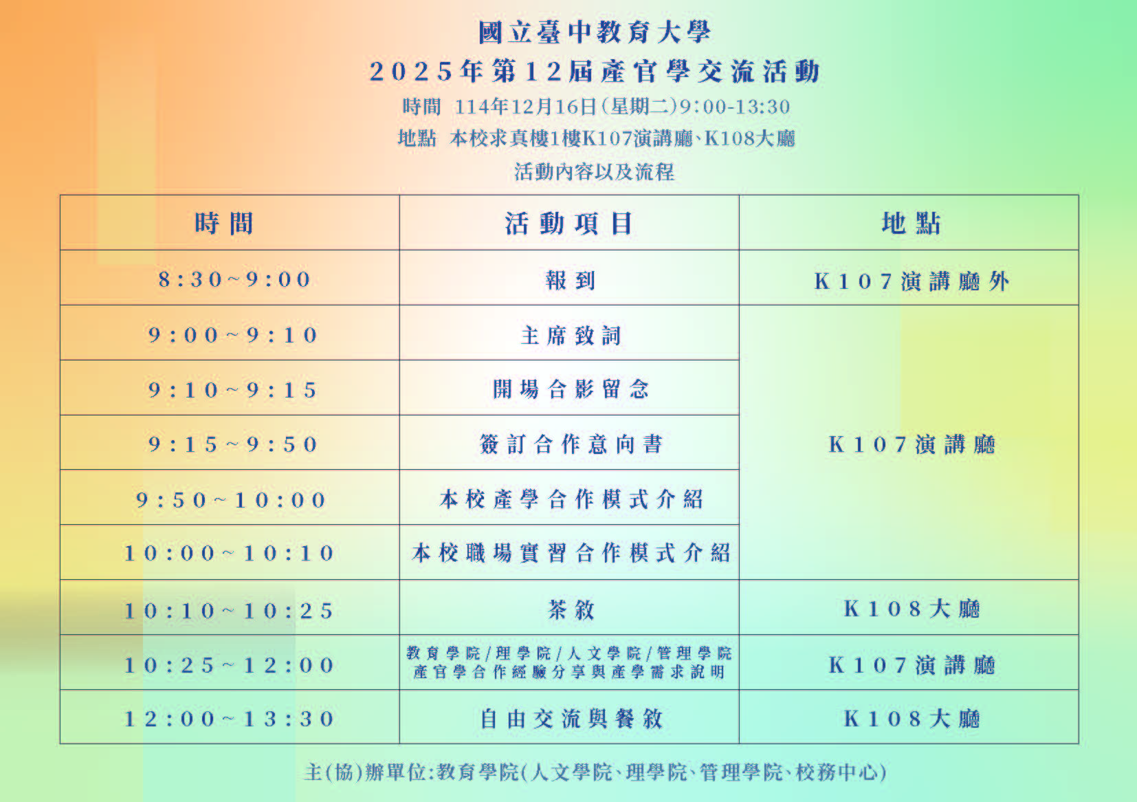 一、為促進本校各學院與產業界合作機會,2025年「第12屆產官學交流活動」謹訂於114年12月16日(星期二)上午9時於求真樓1樓K107演講廳及K108大廳舉辦,由教育學院承辦,國?處、各學院、師培處就業輔導組、智慧教育中心及校務中心協辦。