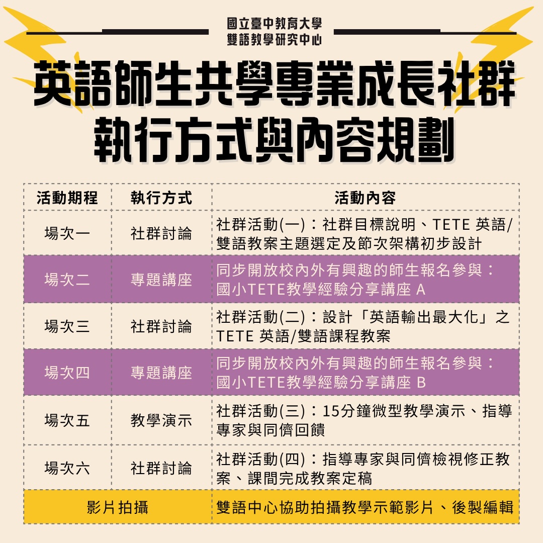 本校雙語教學研究中心辦理「TETE 師生共學專業成長社群」,敬邀本校有興趣的師資生踴躍報名參與